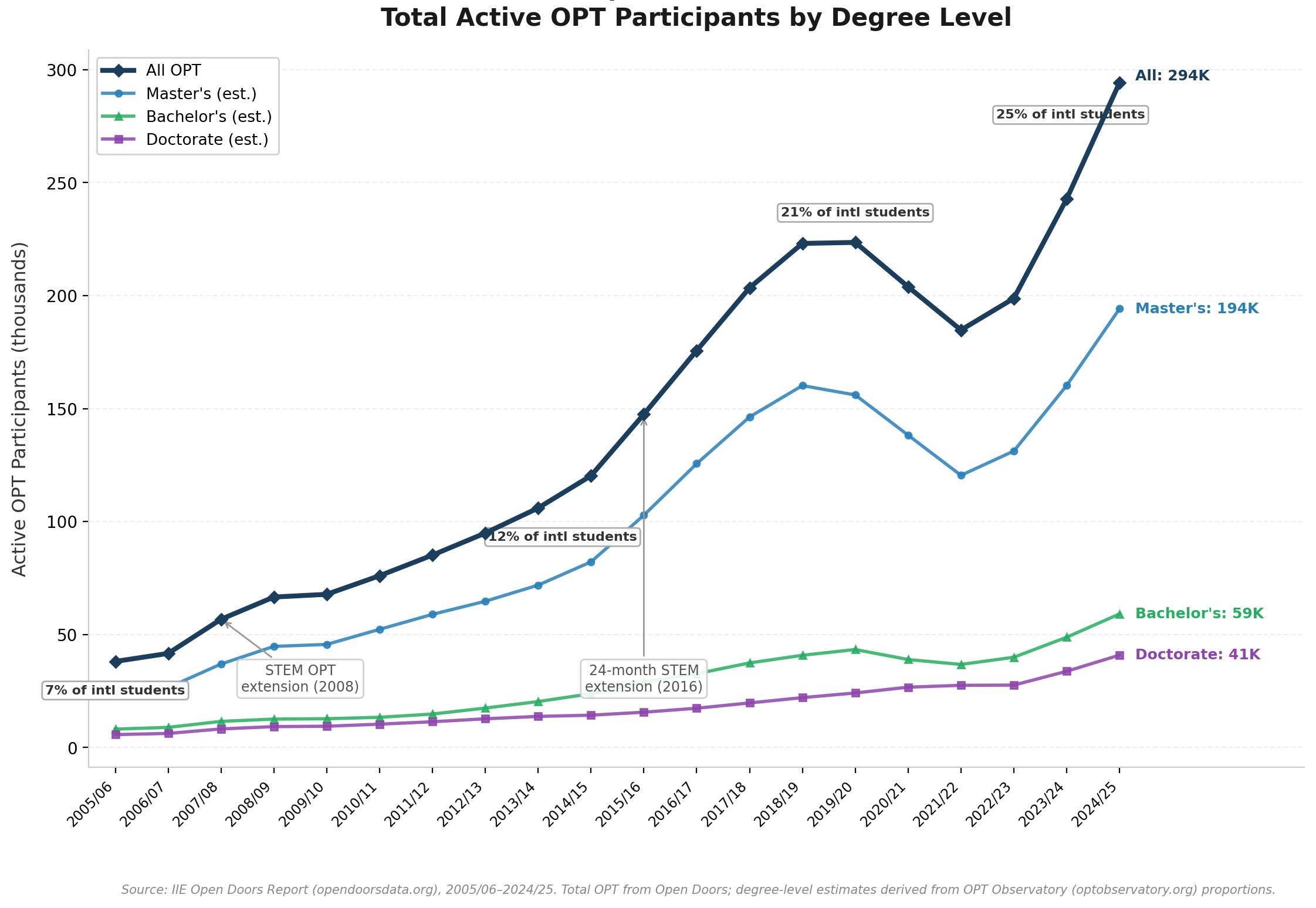 Participation in OPT has more than doubled (+145%) over the past 10 years from 120,287 (2014/15) to 294,253 (2024/25). For proponents, growth is a sign of success. For opponents, it’s cause for concern.