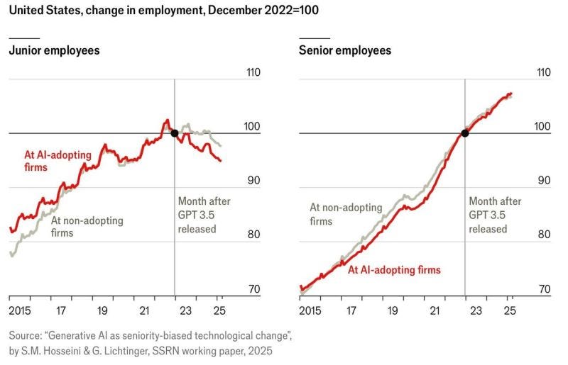 Entry-level tech hiring dropped roughly 25% between 2023 and 2024. More alarmingly, a recent Stanford Digital Economy Lab study found a 16% relative employment decline for workers aged 22 to 25 in AI-exposed occupations, a drop that persists even after controlling for firm-level macroeconomic shocks.