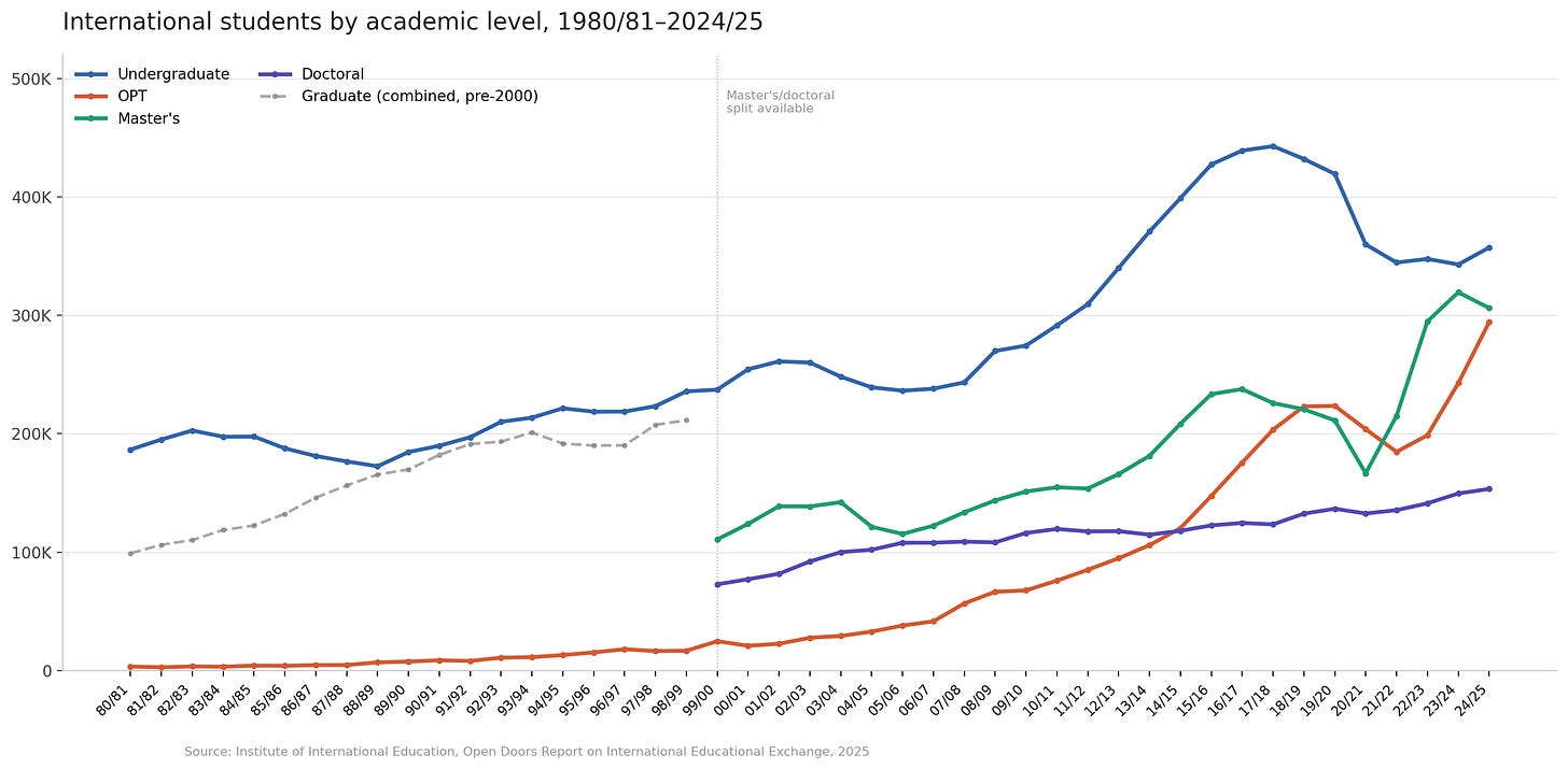 OPT’s growth as a share of the total international student population rose from roughly 1% in 1980 to 4% by 2000 to 25% by 2025.