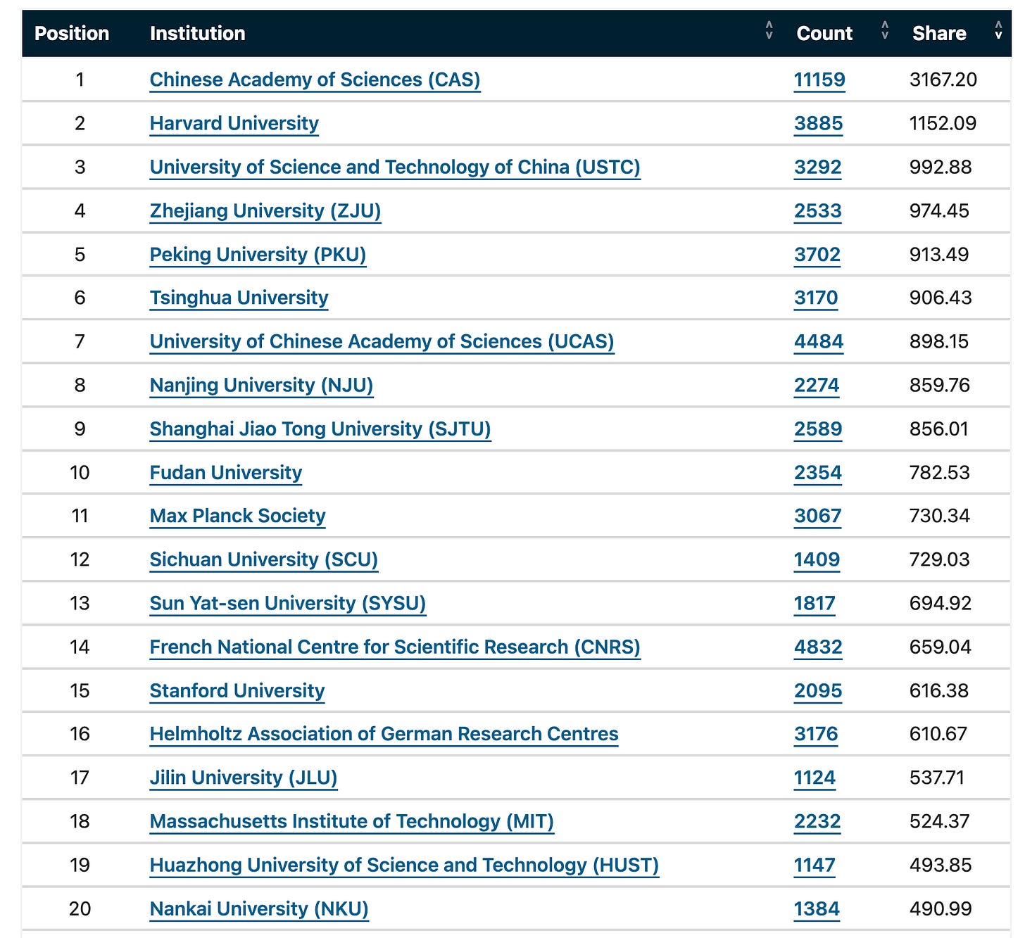 Harvard, MIT, and Stanford are all in the Top 20, but so are 14 universities from China, 2 from Germany, and 1 from France.