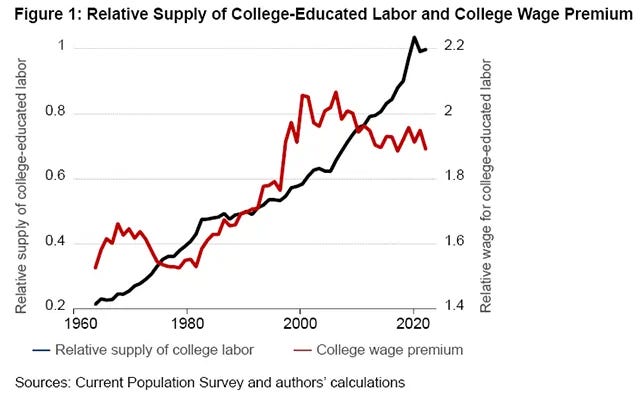 Recent analysis from the Federal Reserve Bank of Cleveland found technical change may no longer favor college graduates the way it once did. The disproportionate rise in productivity among college-educated workers (the engine that drove the college wage premium through in the last century) has plateaued since 2000. If that trend holds, the growing supply of college-educated workers will push the premium down further, not up.