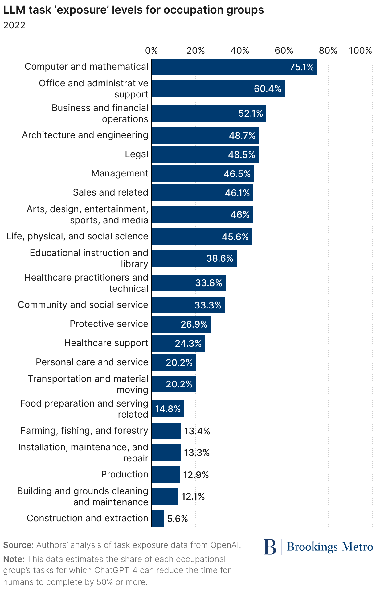 Analysis from Brookings highlights how the tasks that large language models handle competently—synthesis, basic coding, and first-draft generation—map directly onto entry-level knowledge work and concentrates in top majors for international students, including computer science and business analytics.